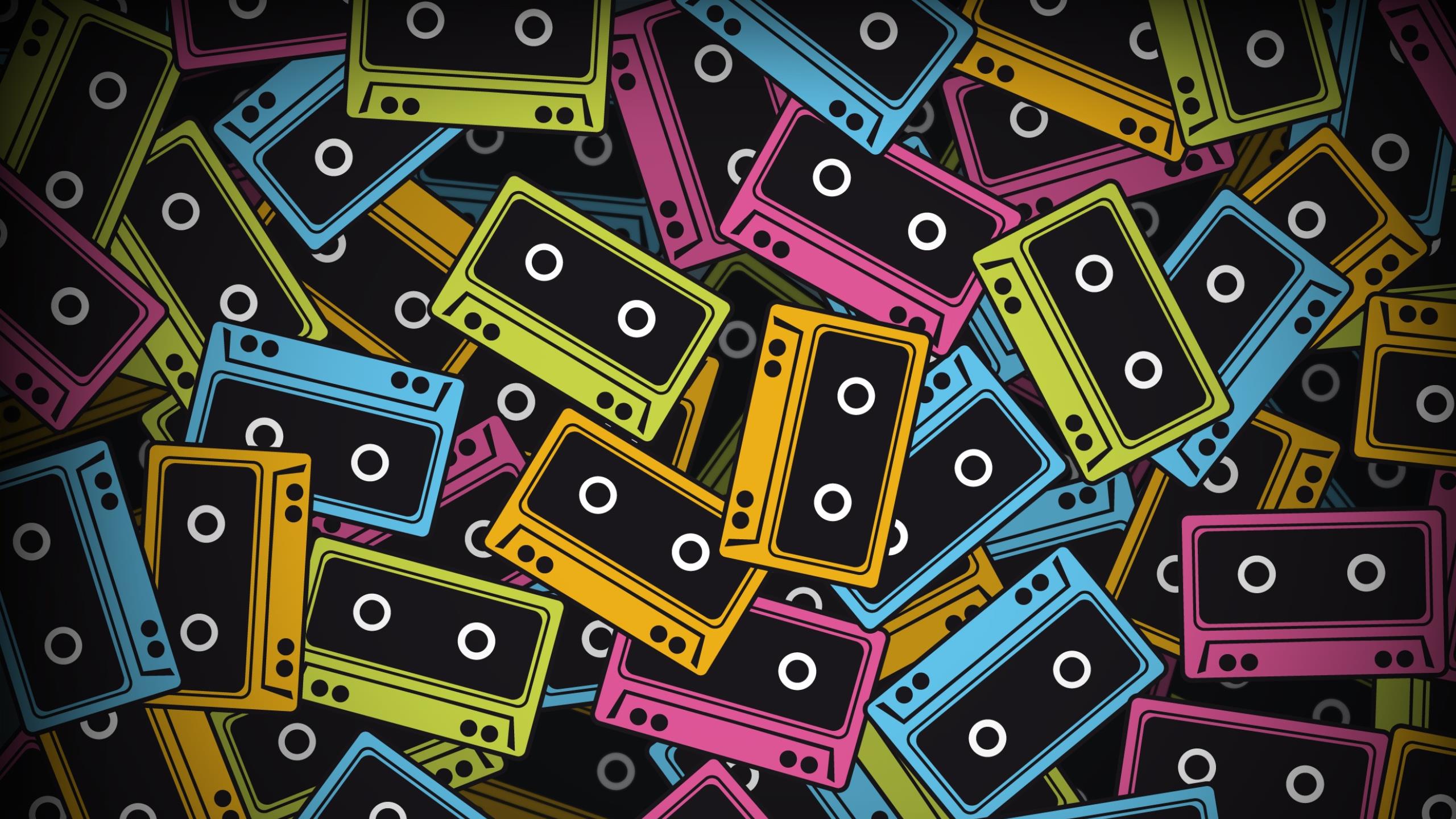 Description: A bunch of colorful cassettes are scattered together on a black background with a black background and a white border.