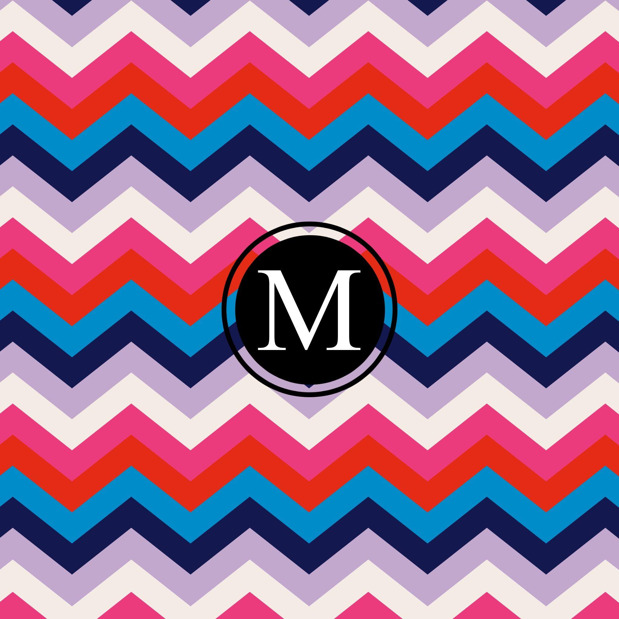 Description: A colorful chevron pattern with a monogrammed m on it's center and a black circle on the middle.