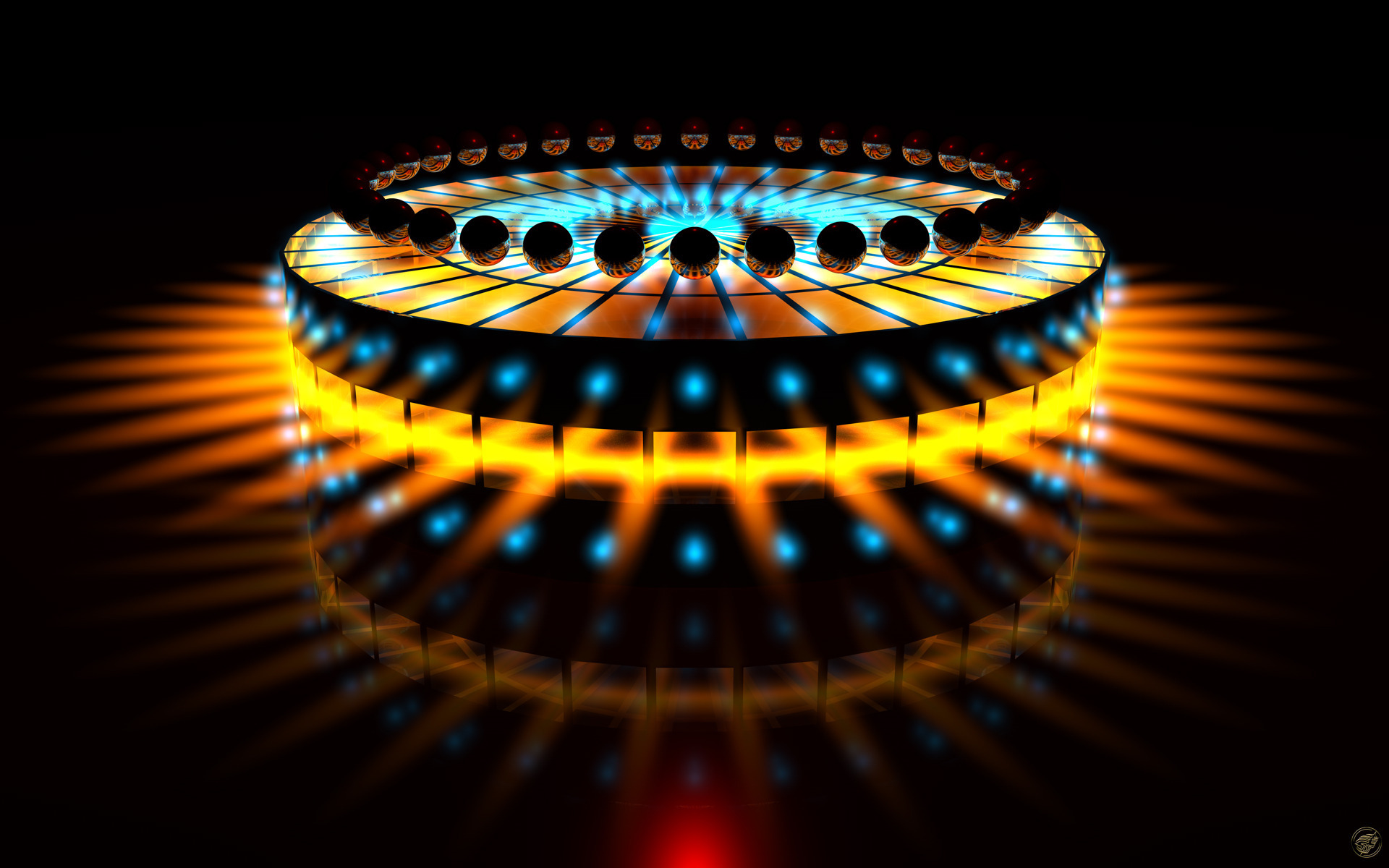 Description: A colorful circular object with a black background and a red light at the bottom of it and a red light at the top.