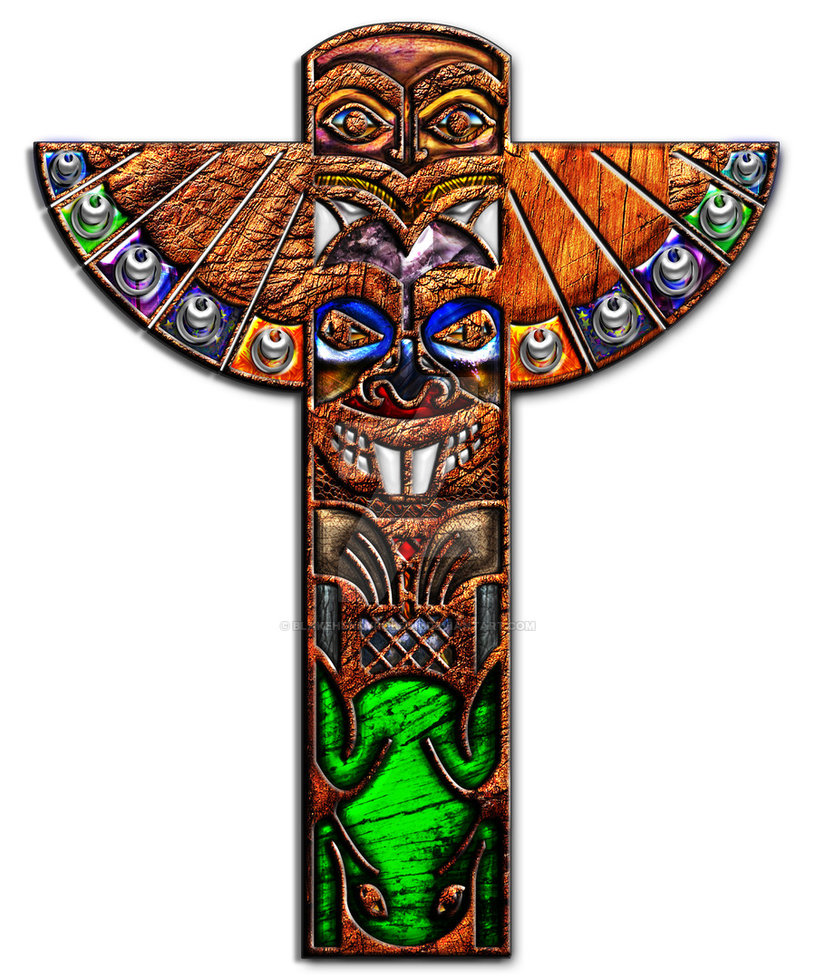 Description: A cross with a colorful design on it and a face on the cross with eyes and hands on it.