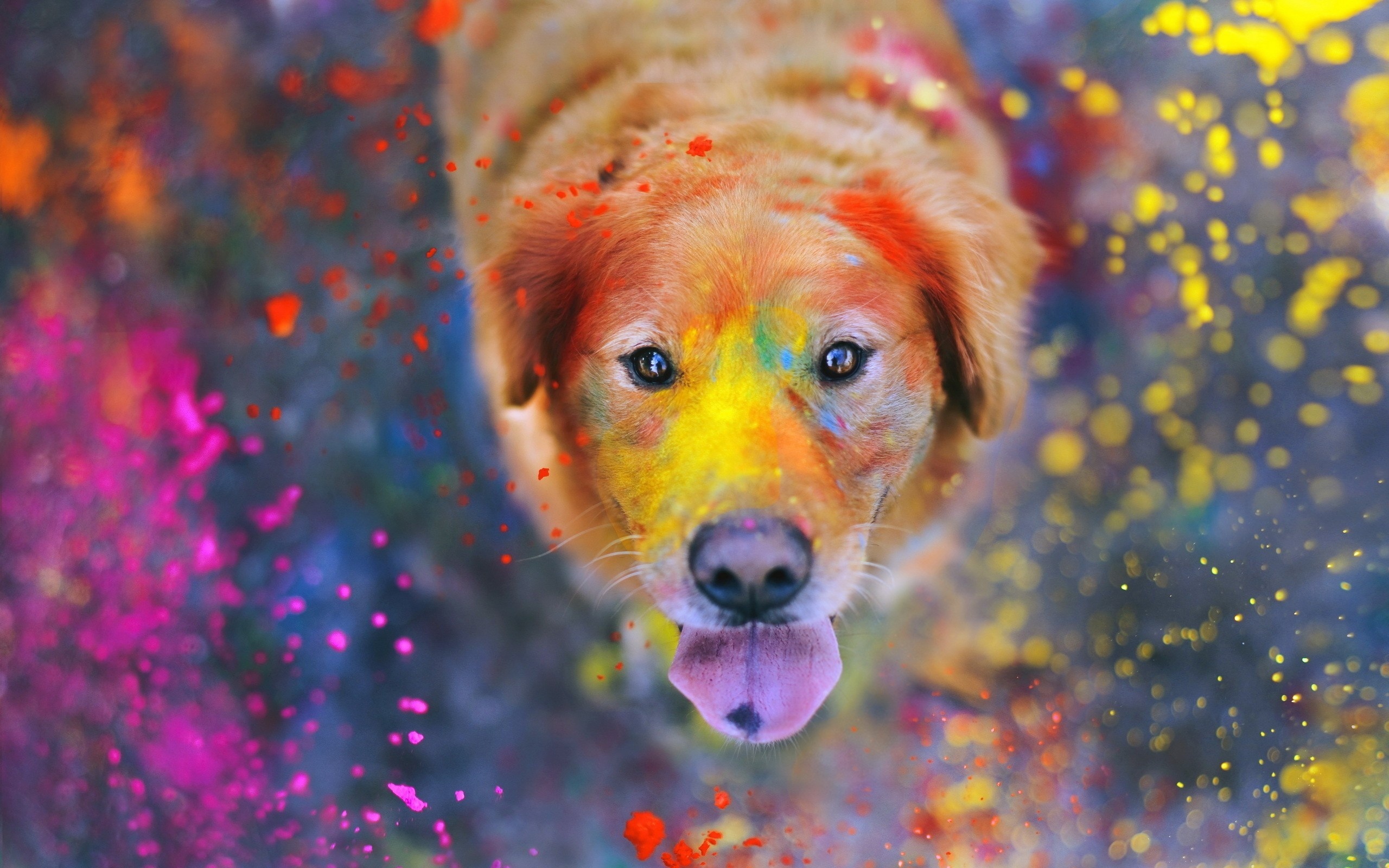 Description: A dog with a colorful face and a yellow nose and tongue is looking at the camera with a colorful background.