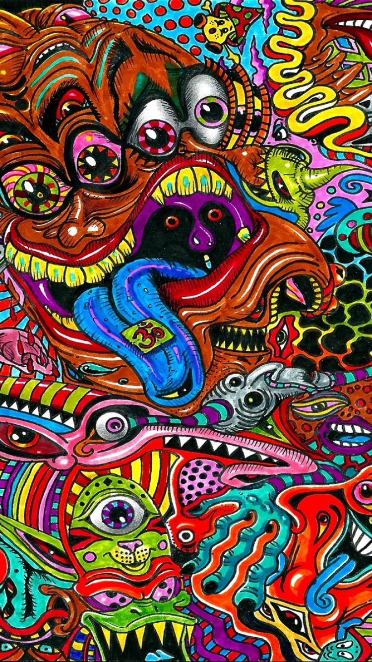Description: A painting of a dog with colorful patterns on it's face and mouth.