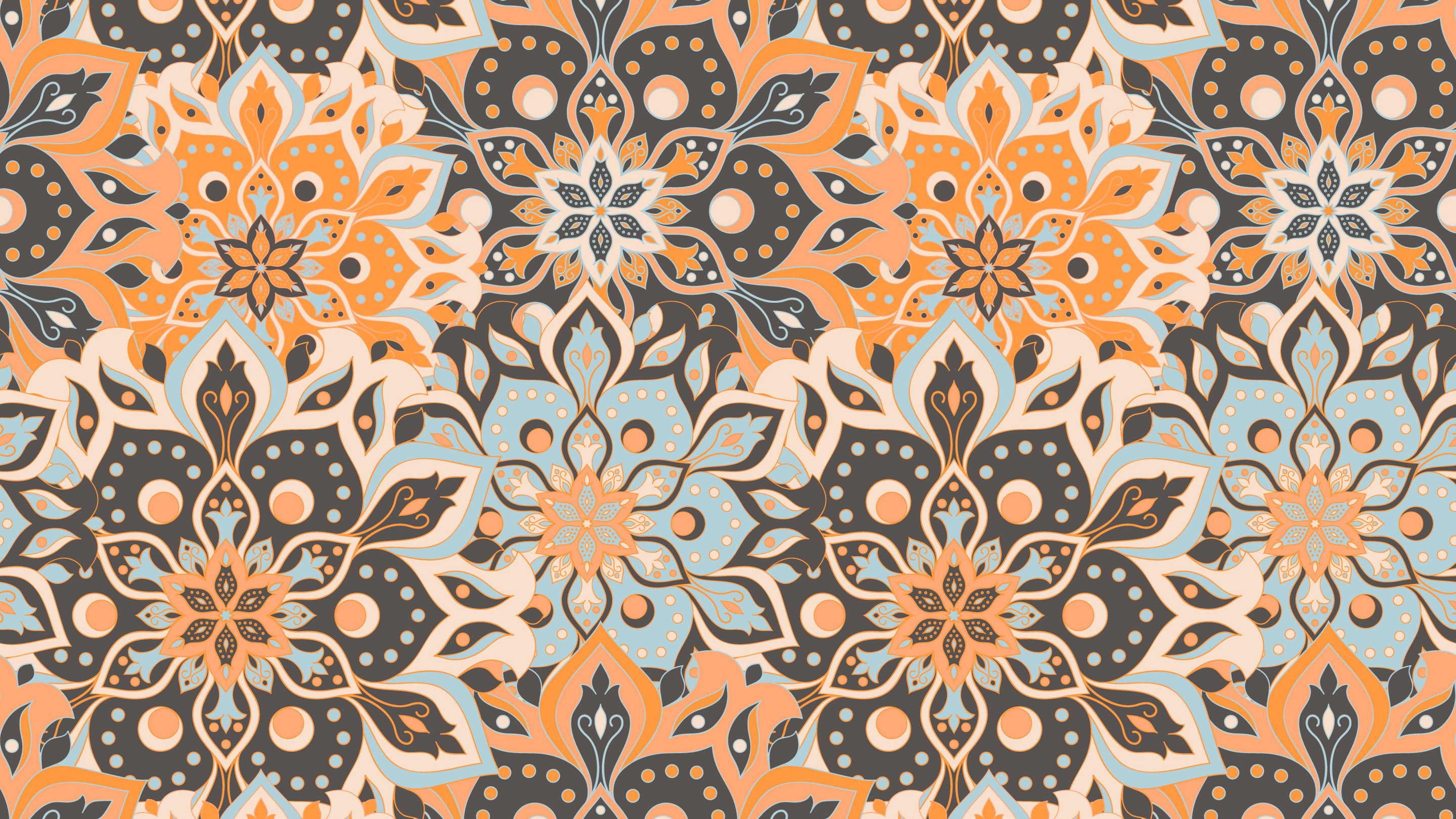 Description: A colorful floral pattern with many different colors and shapes on a black background with a white center and a blue center.