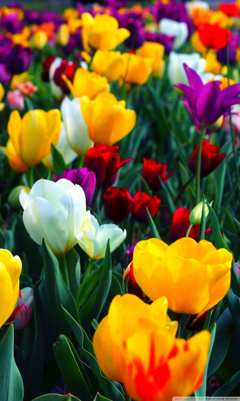 Description: A field of colorful flowers with a sky background and a blurry image of the flowers in the background.