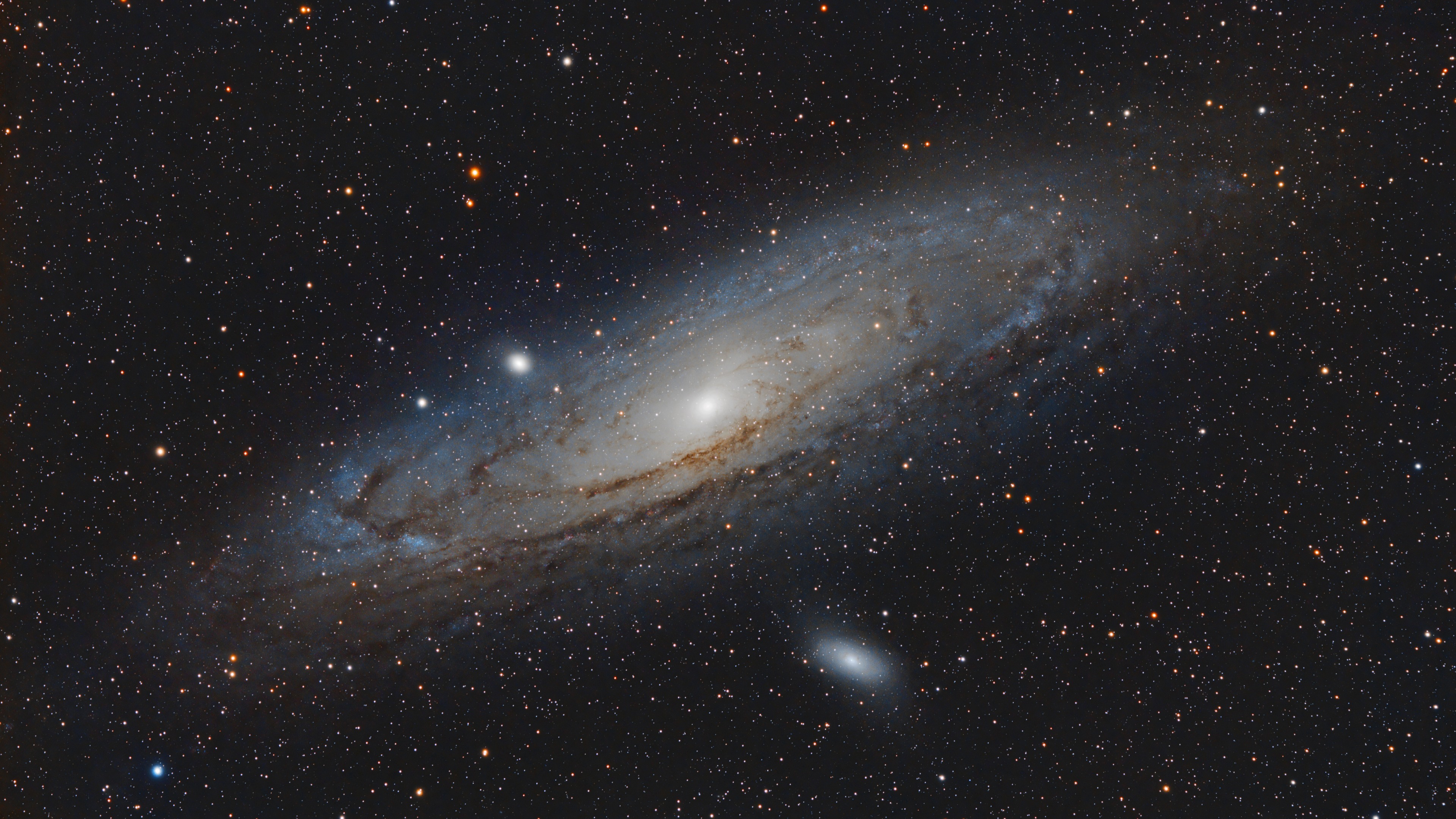 Description: A very large and colorful galaxy in the sky with stars around it and a bright blue disk in the center.