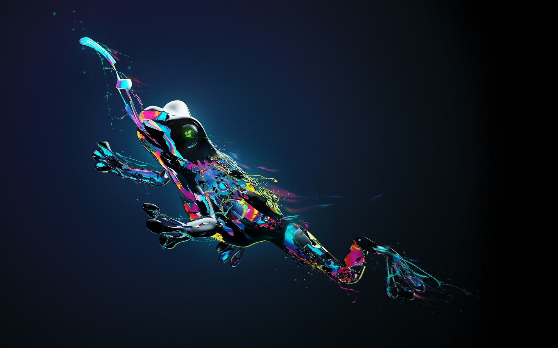 Description: A colorful lizard is in the air with its tail extended and it's head tilted to the side.