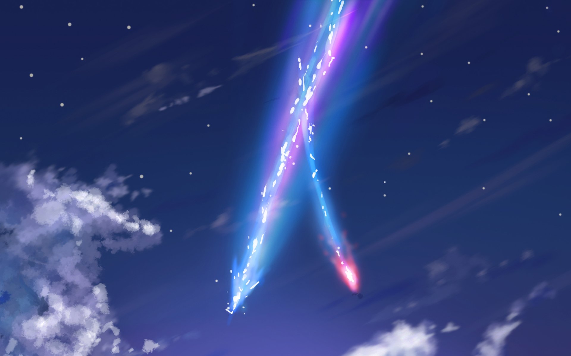 Description: A very long colorful object flying through the sky with clouds below it and a bright light shining on it.