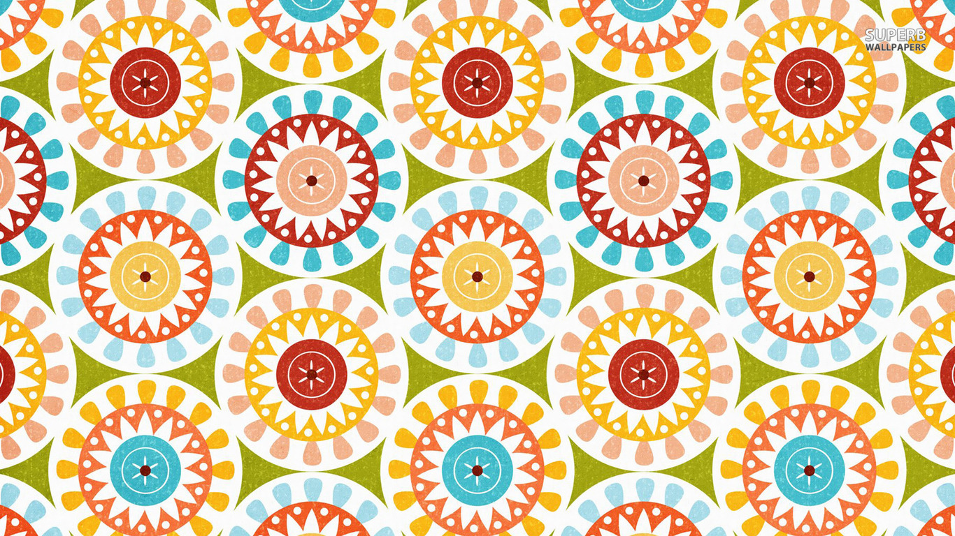 Description: A colorful pattern with circles and flowers on a white background with a green background and a red.