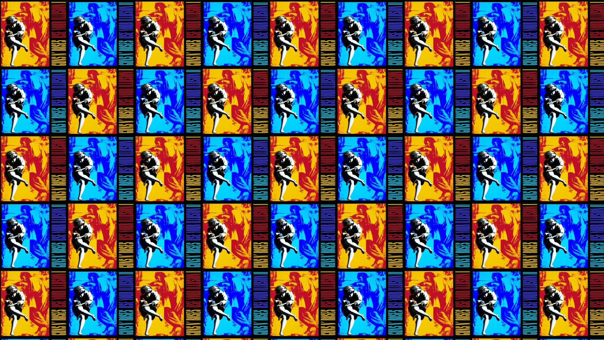 Description: A colorful pattern with a man on a skateboard in the middle of it.