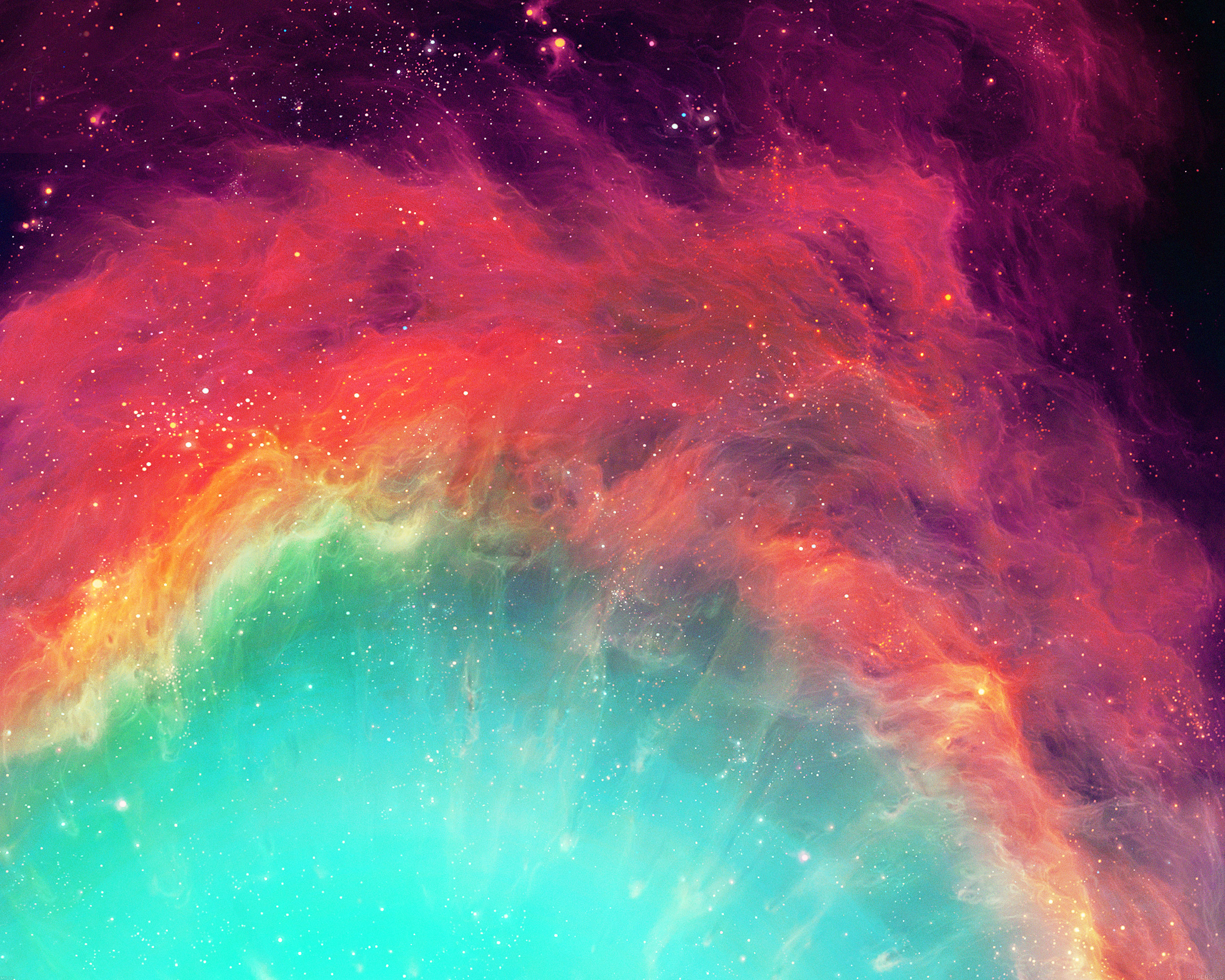 Description: A colorful picture of a star filled sky with a rainbow center and stars in the center of the image.