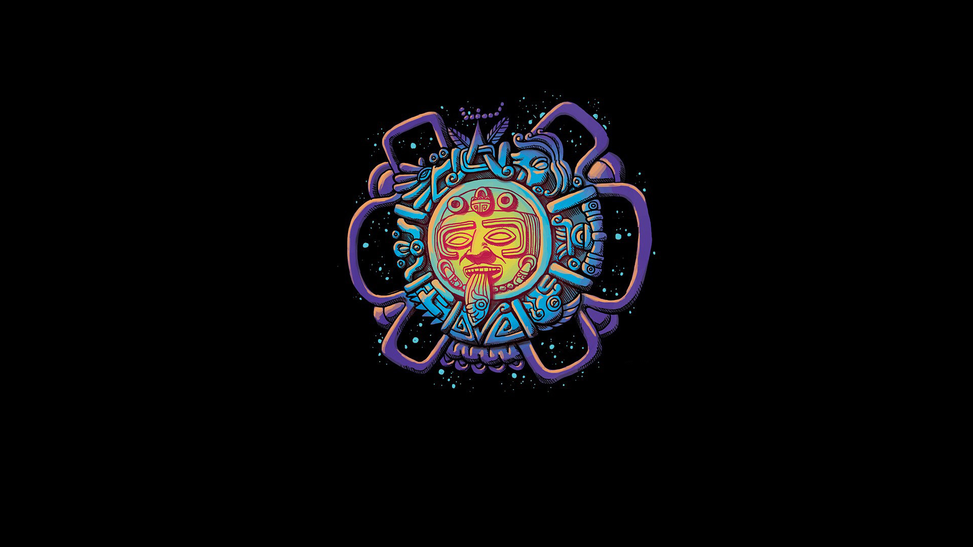 Description: A colorful sun face on a black background with a blue and purple design on it's face and a black background.