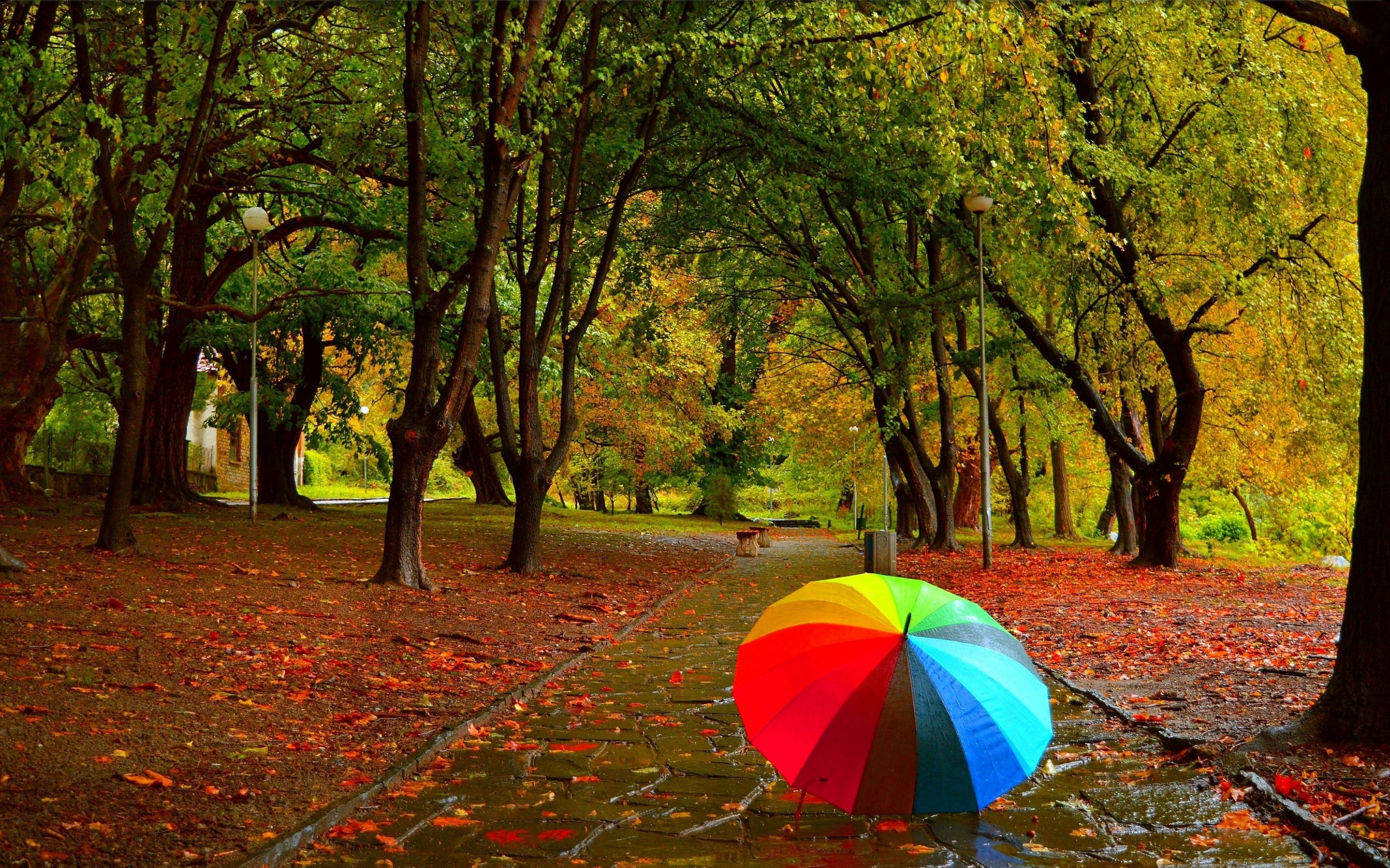 Description: A colorful umbrella is sitting in the middle of a park with fallen leaves on the ground and trees lining the path.