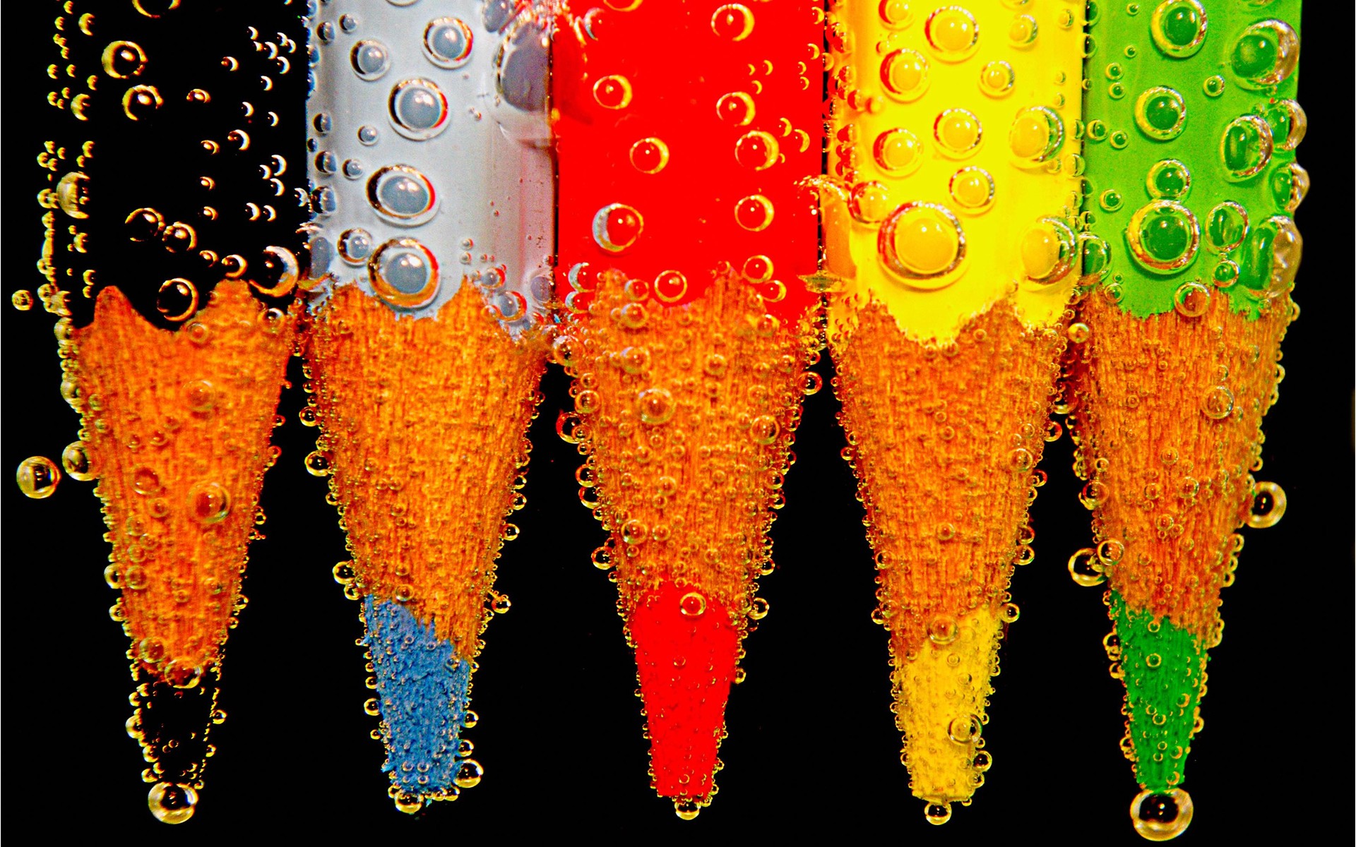 Description: A group of colorful water droplets on a black background with a black background and a black background with a white border.