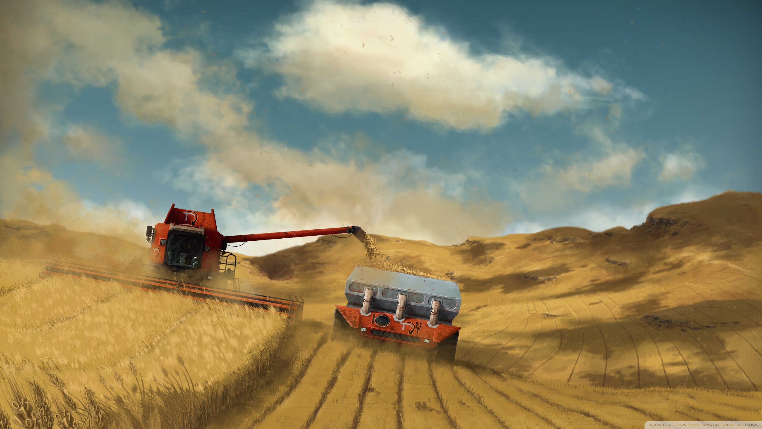 Description: A painting of a combine being pulled by a tractor in a field of wheat by a combineer in the distance.