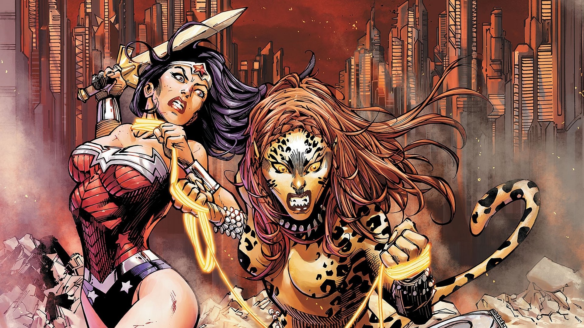 Description: A comic book cover with two women in costume and one is holding a sword and the other is holding a leopard.