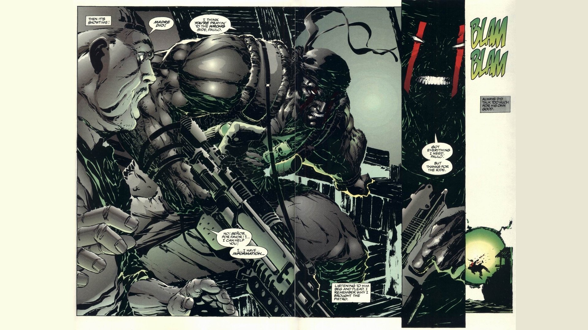 Description: A comic page with a comic character holding a gun and a green lantern in the background with a comic strip.
