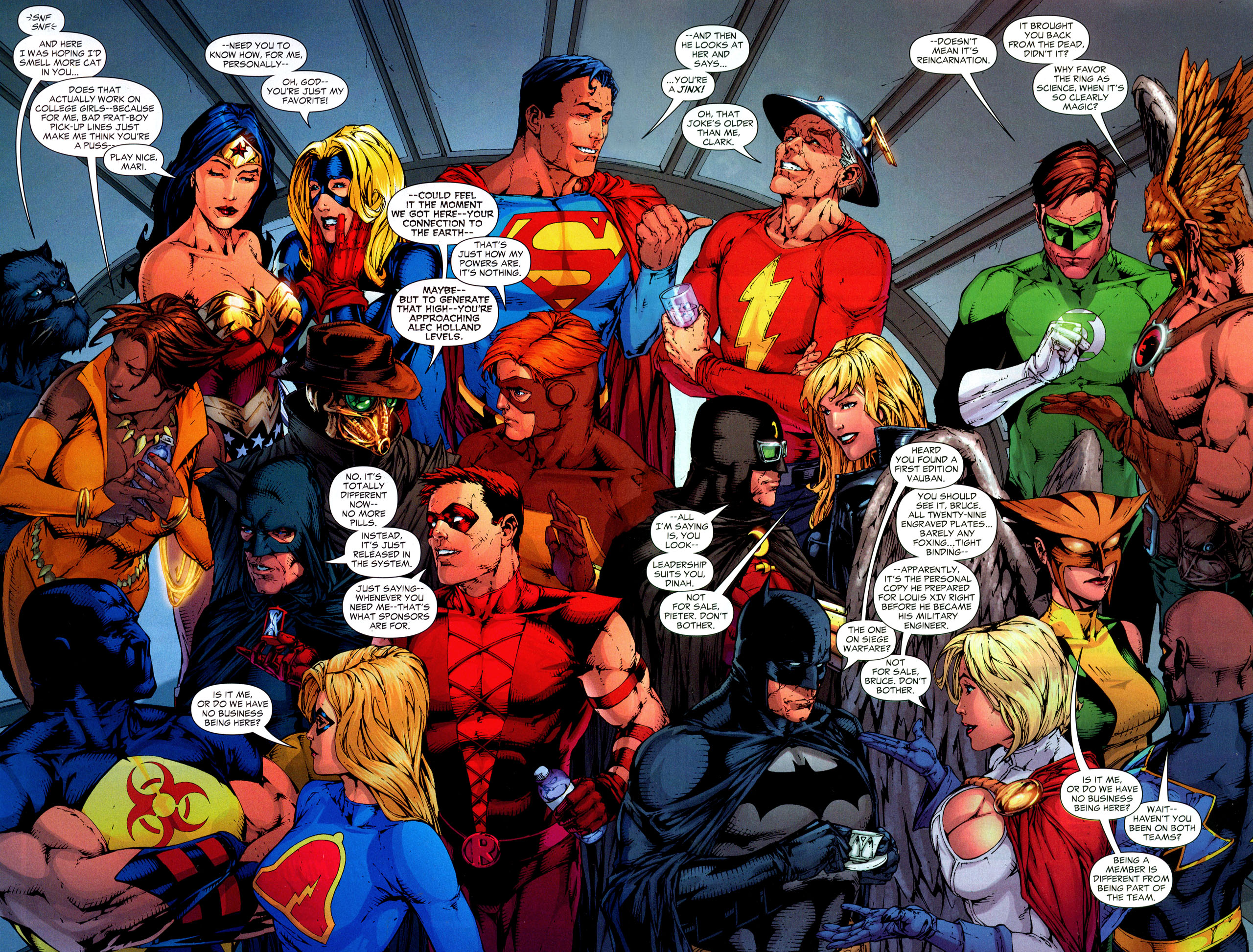 Description: A group of comic characters standing together in a comic strip with comic bubbles above them and a comic strip below.