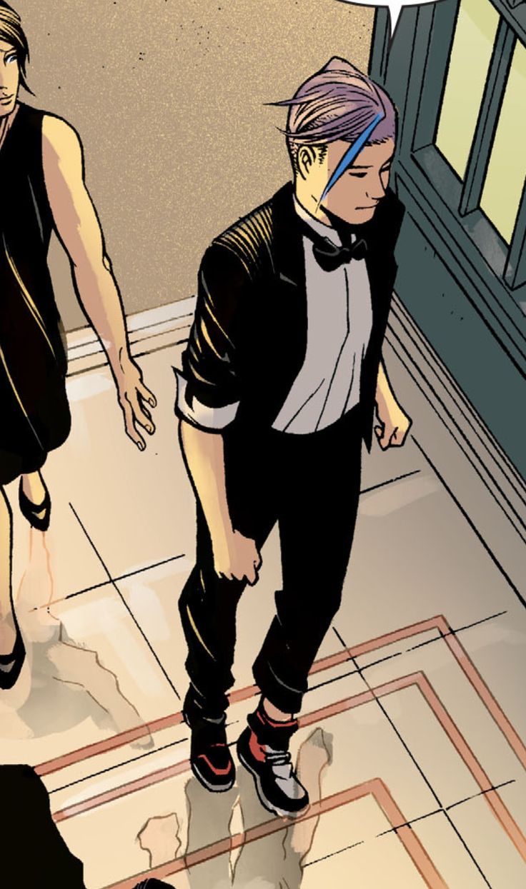 Description: A comic strip with a man in a black outfit and a woman in a white shirt and black pants.