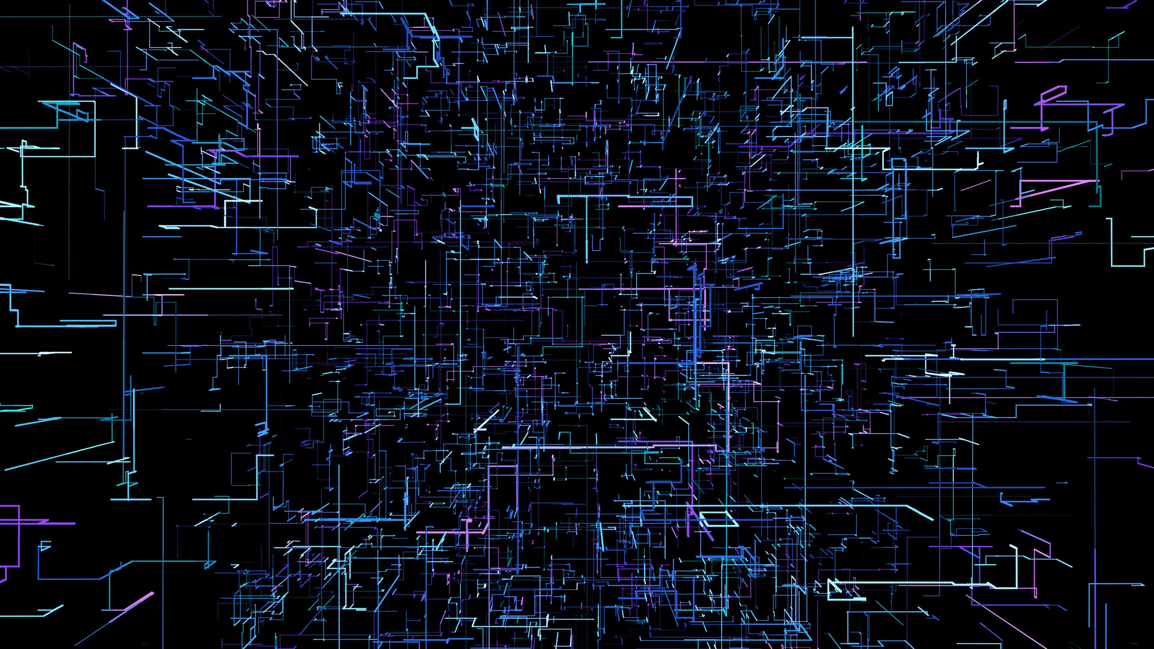 Description: A very large complex structure with lines and dots in it's center and a black background with blue and purple lines.