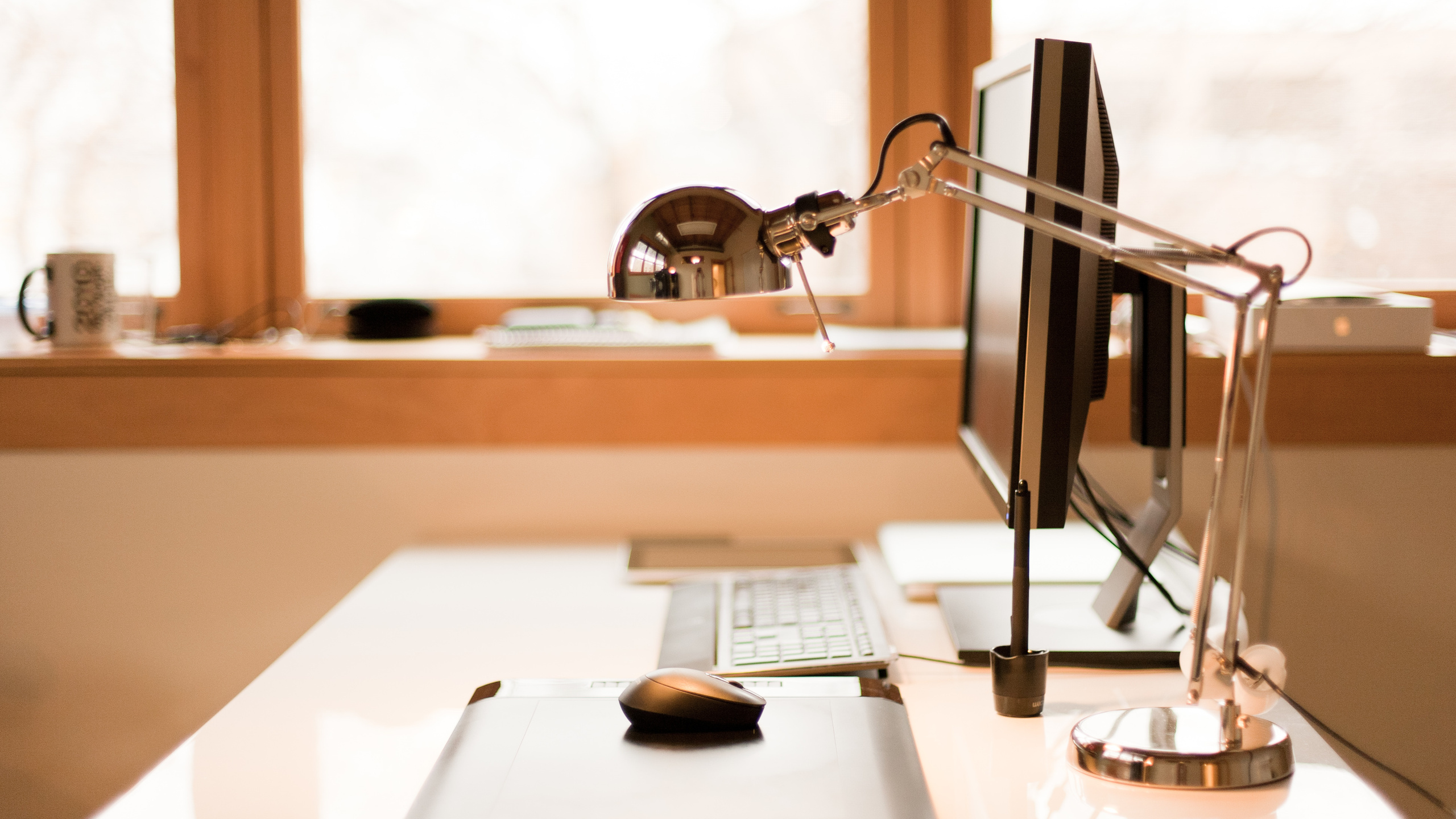 Description: A computer monitor sitting on top of a desk next to a keyboard and mouse on a desk next to a window.