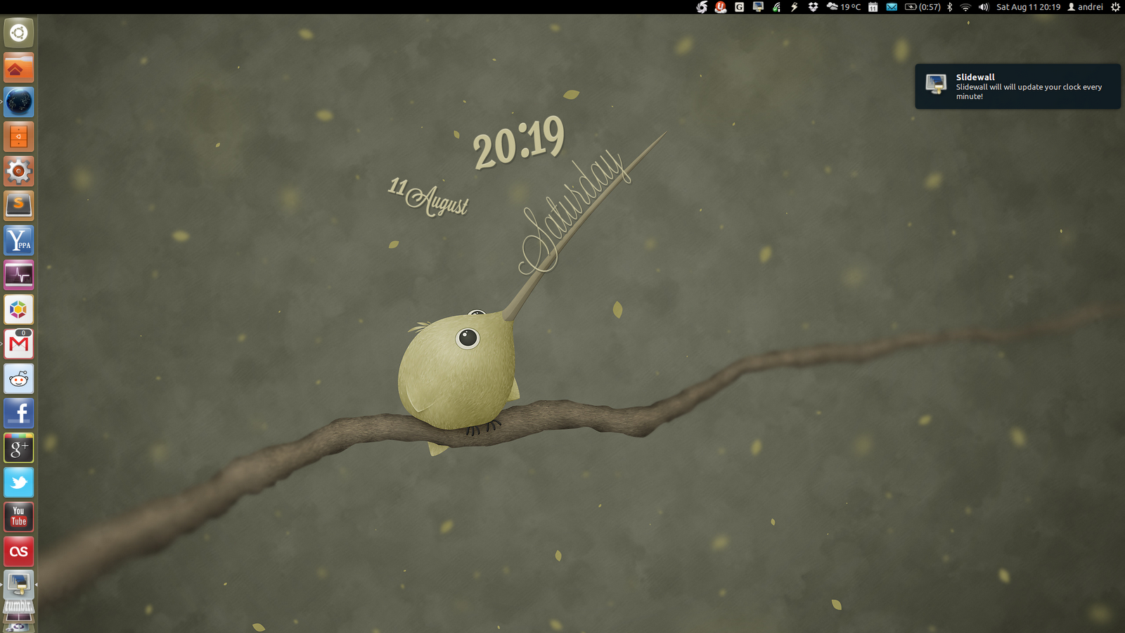 Description: A computer screen with a picture of a bird on a branch with a date on it and a message written on the branch.