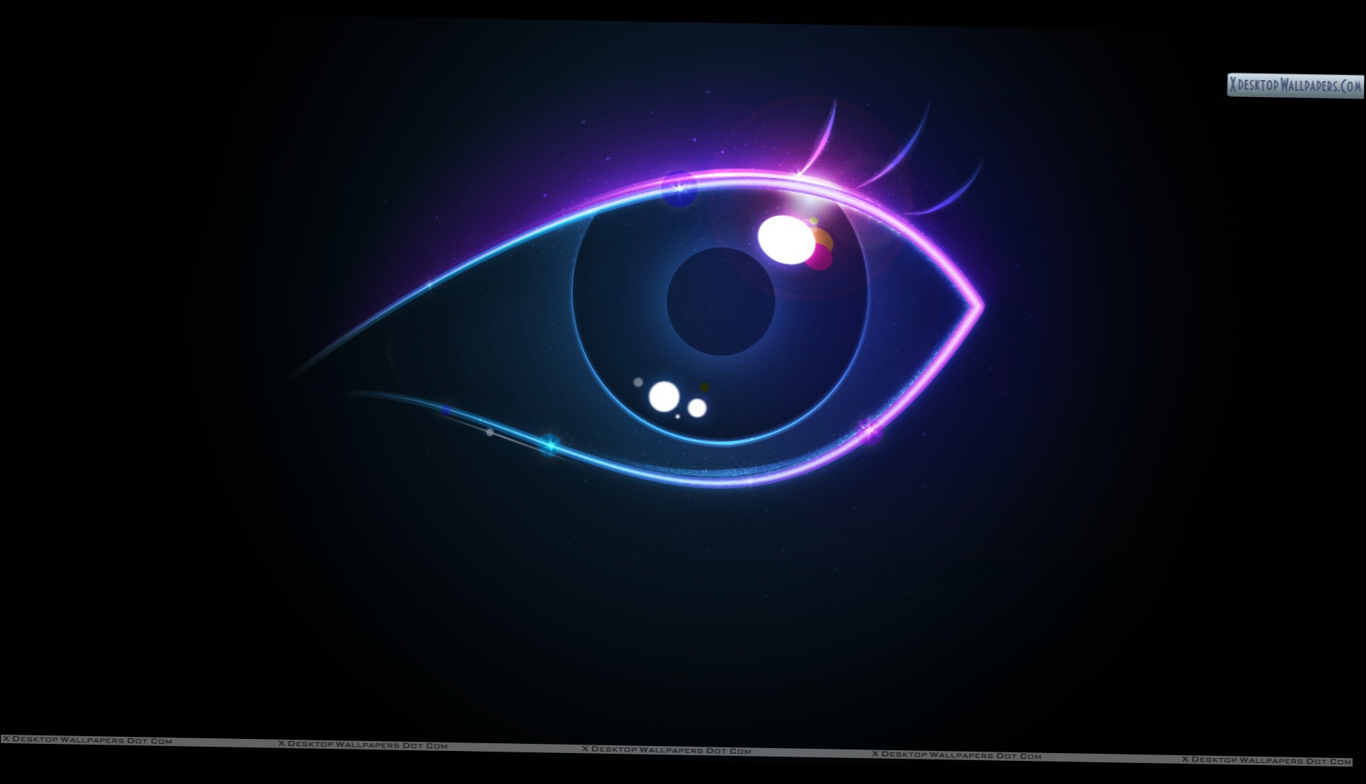 Description: A computer screen with a glowing eye on it's side and a black background with a white line running through the eye.