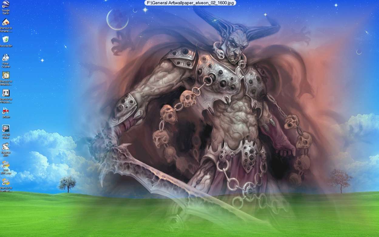 Description: A computer screen with a painting of a man holding a sword and a demon on it's face.