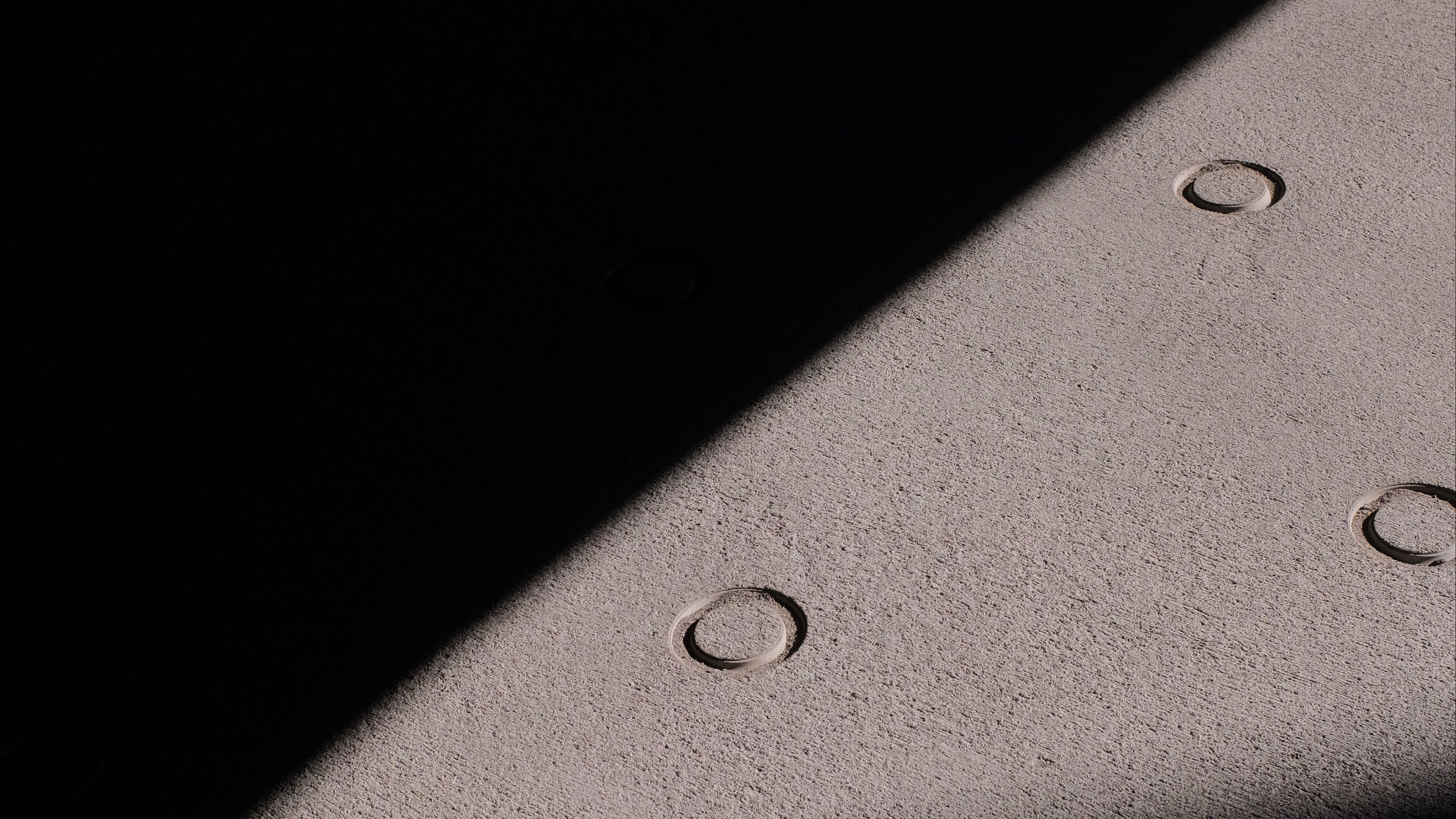 Description: A concrete bench with three circles on it's side and a shadow of a person walking on the sidewalk.