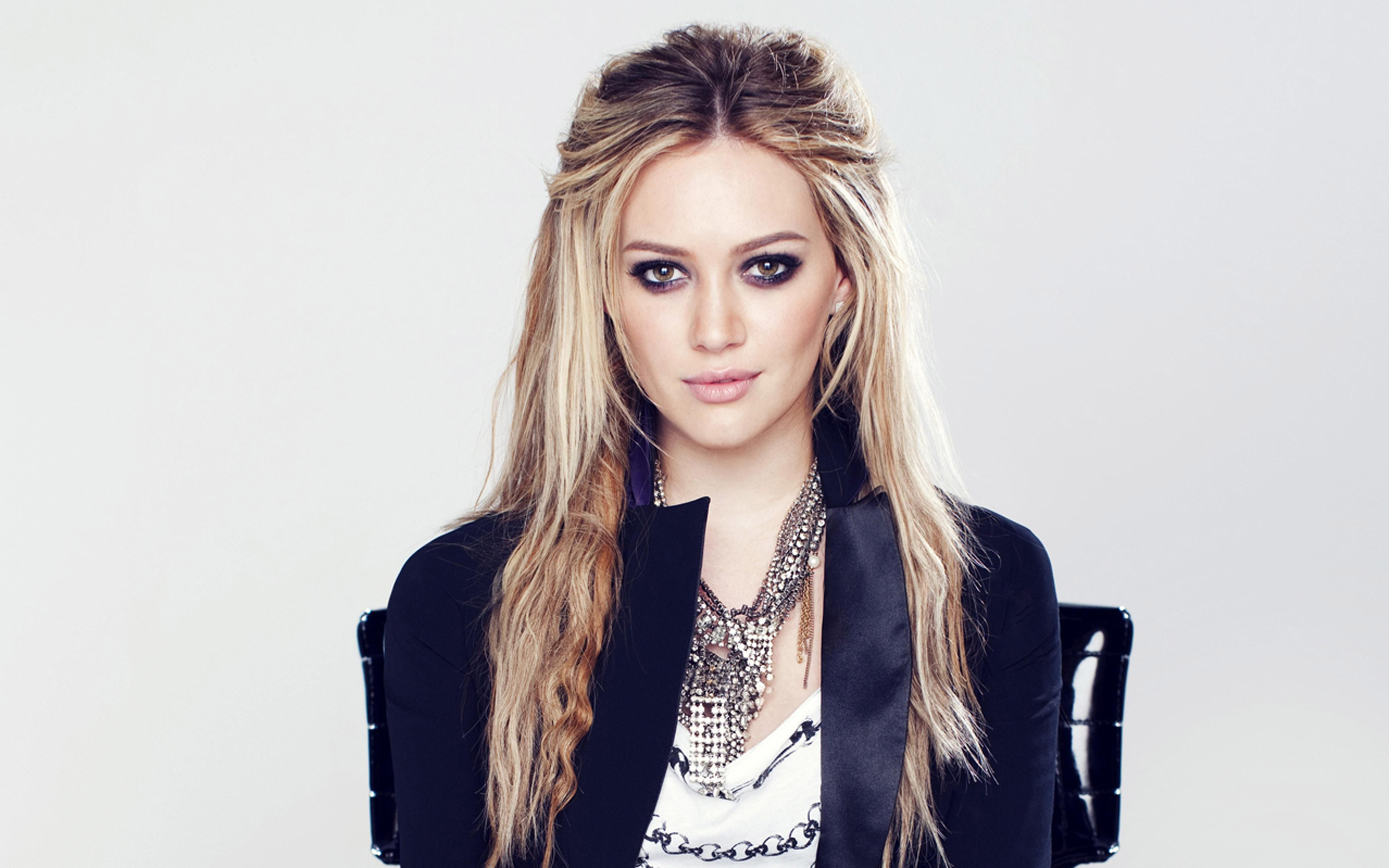 Description: A woman with long hair and a black jacket on posing for a picture with a white background and a black chair.