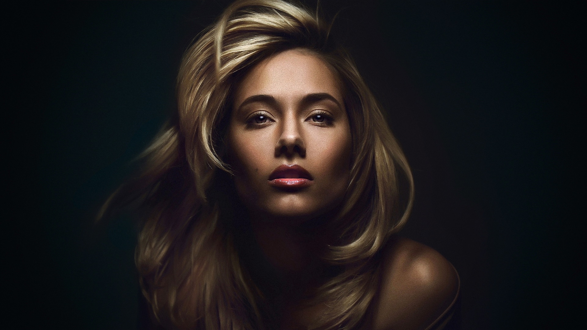 Description: A woman with long blonde hair and a black background is shown in this image.