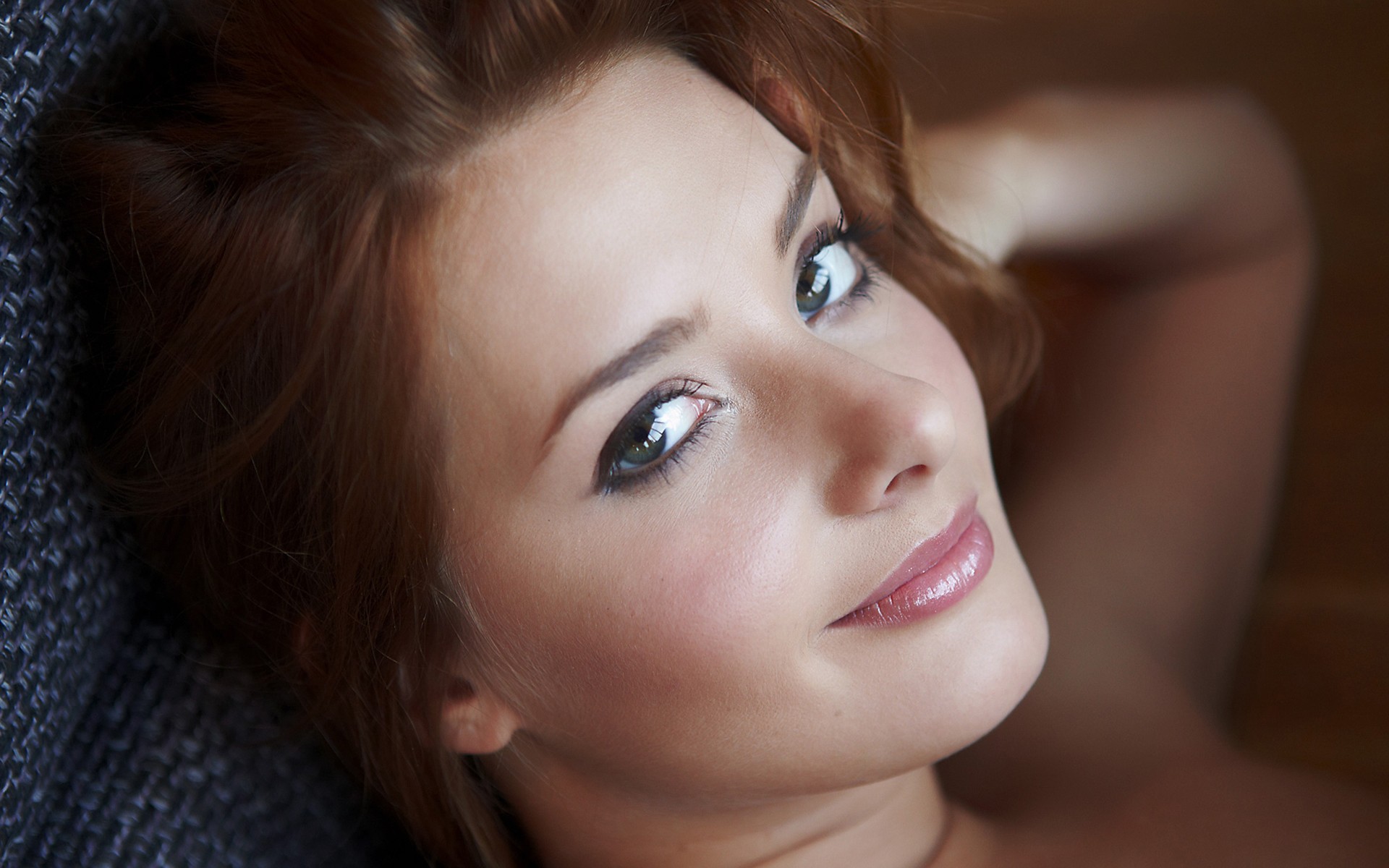 Description: A woman with blue eyes and a blue sweater on her back is smiling at the camera and looking up.