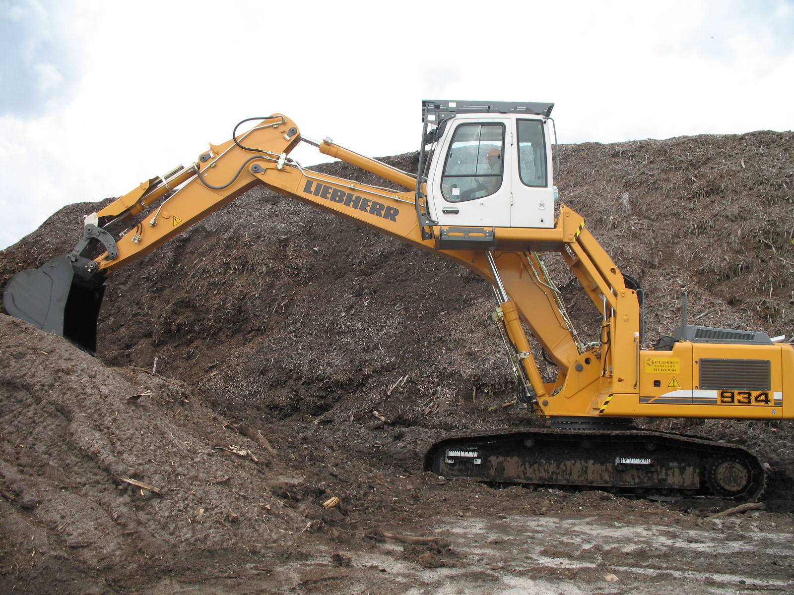 Description: A large yellow and white construction vehicle in a pile of dirt and dirt mounds with a sky background and a white cloud.