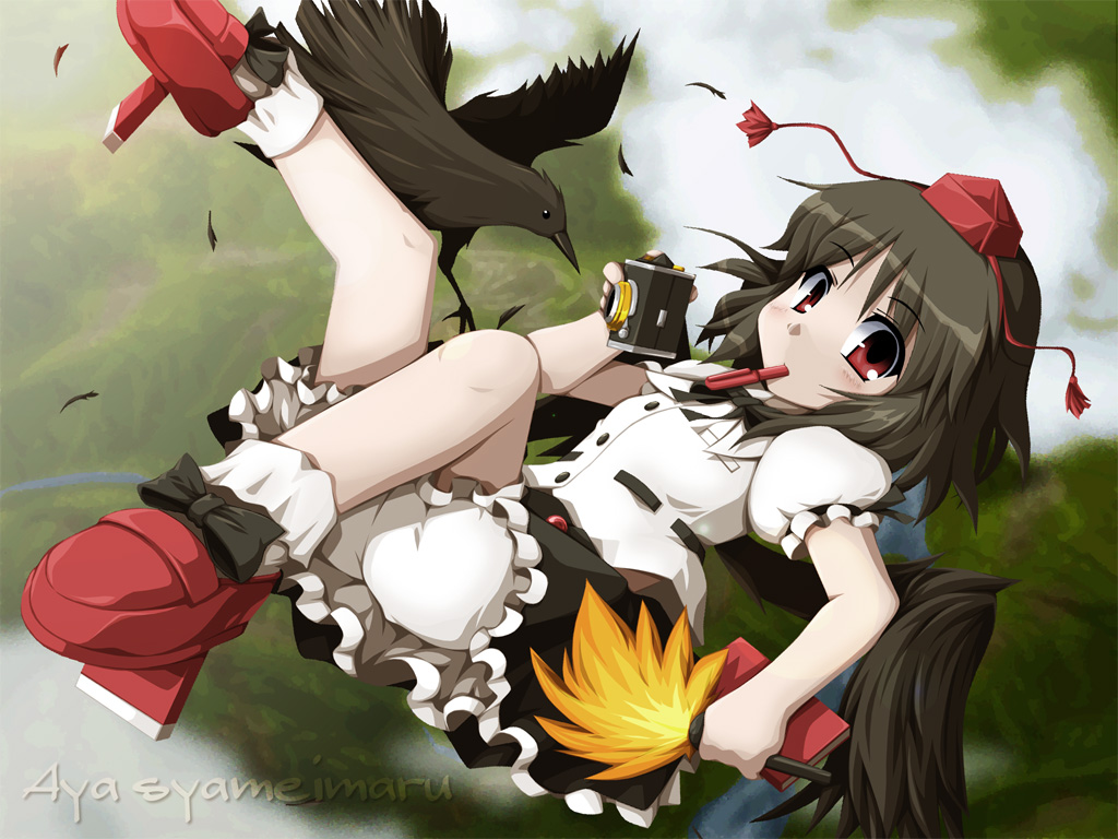 Description: A woman dressed in a cosplay outfit and boots with a bird on her shoulder and a bird on her shoulder.