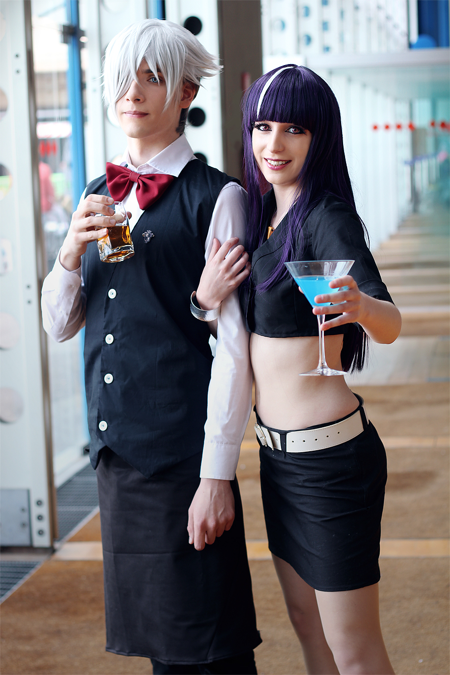 Description: A man and a woman dressed up in costumes holding drinks and posing for a picture together in a hallway.