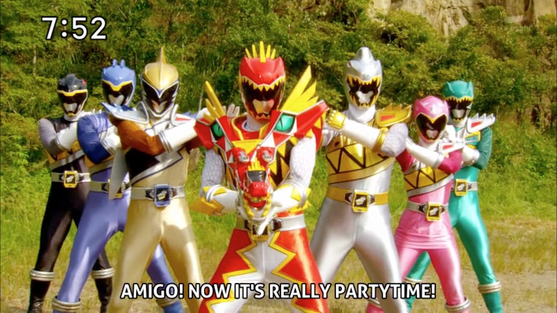 Description: A group of people in costumes standing next to each other in a field with trees in the background and a caption that reads.