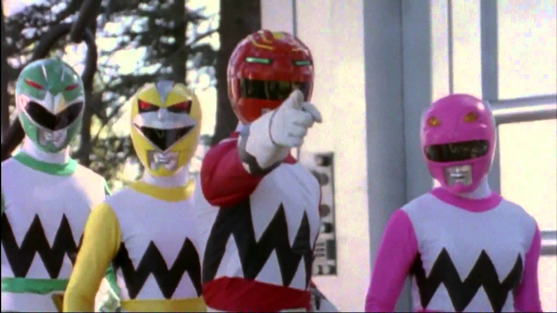 Description: A group of people in costumes standing next to each other in front of a building with a sign that says power rangers.