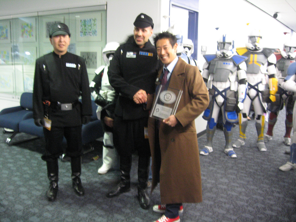 Description: A group of people standing around each other in costumes and uniforms with a plaque in front of them that says.