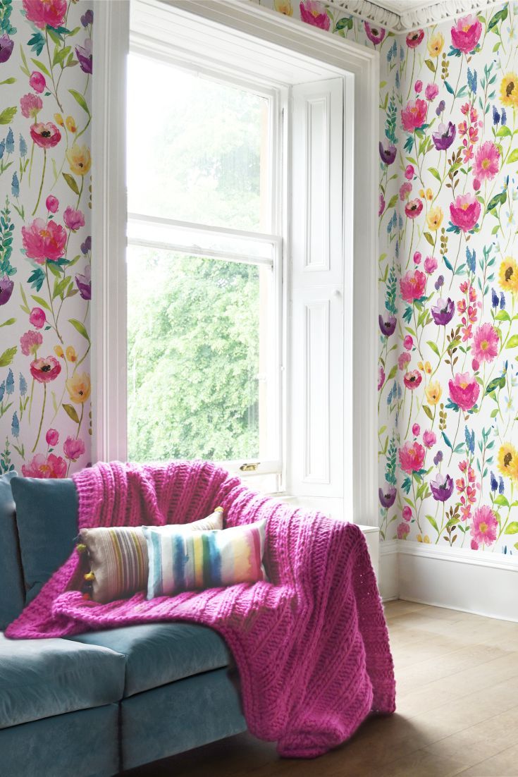 Description: A couch with a blanket on it in front of a window with a flowered wallpaper on it.