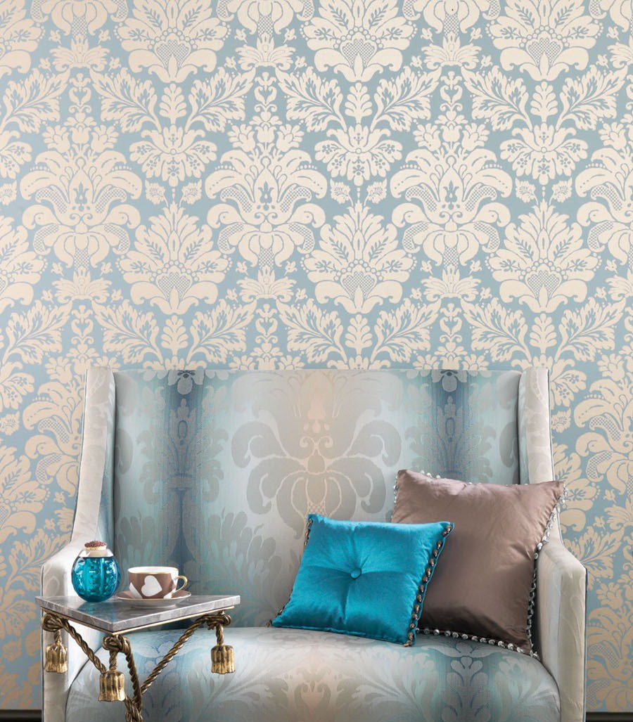 Description: A couch with a blue pillow and a blue and white wallpaper behind it and a table with a blue vase on it.
