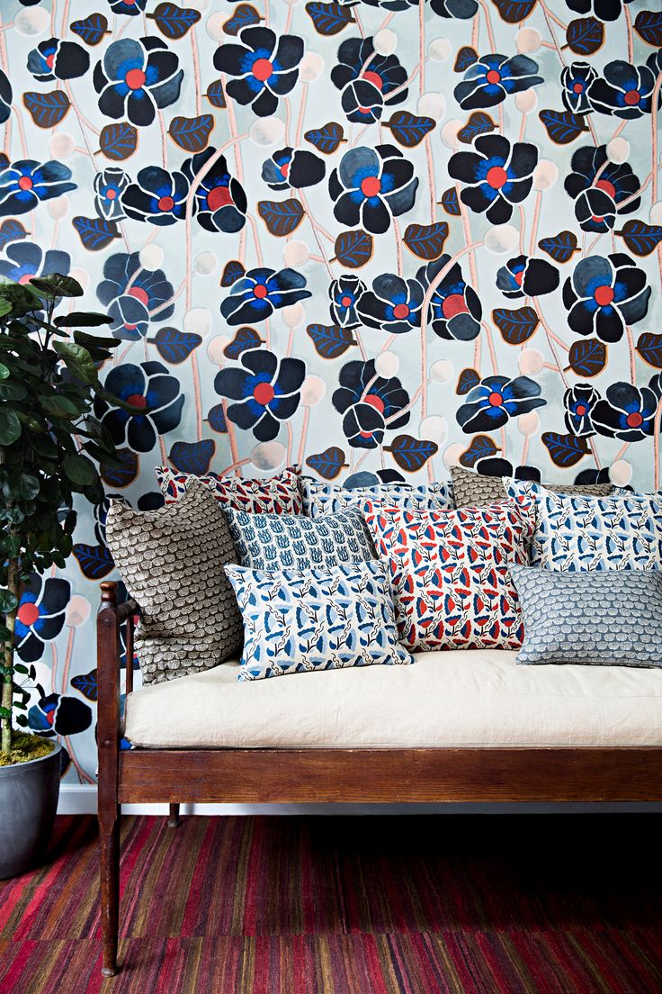 Description: A couch with a bunch of pillows on it in front of a wall with a flower pattern on it.