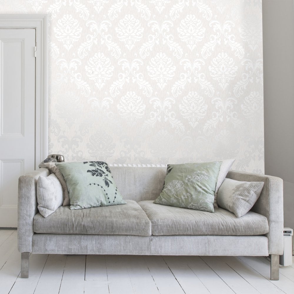 Description: A couch with pillows on it in front of a wall with a white door and a white door frame.