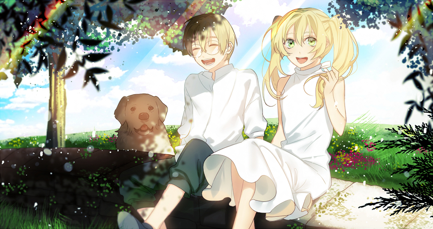 Description: A couple of people sitting on a bench in a park with a teddy bear in the background and a sky background.