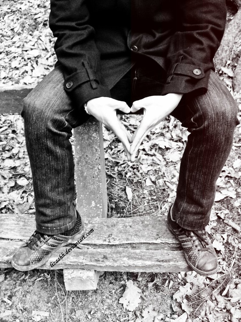 Description: A couple of people sitting on a bench in the woods together with their hands in the shape of a heart.