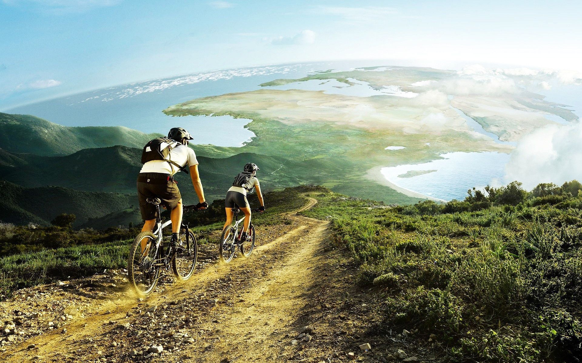Description: A couple of people riding bikes down a dirt road next to a lake and mountains in the background with a dog.
