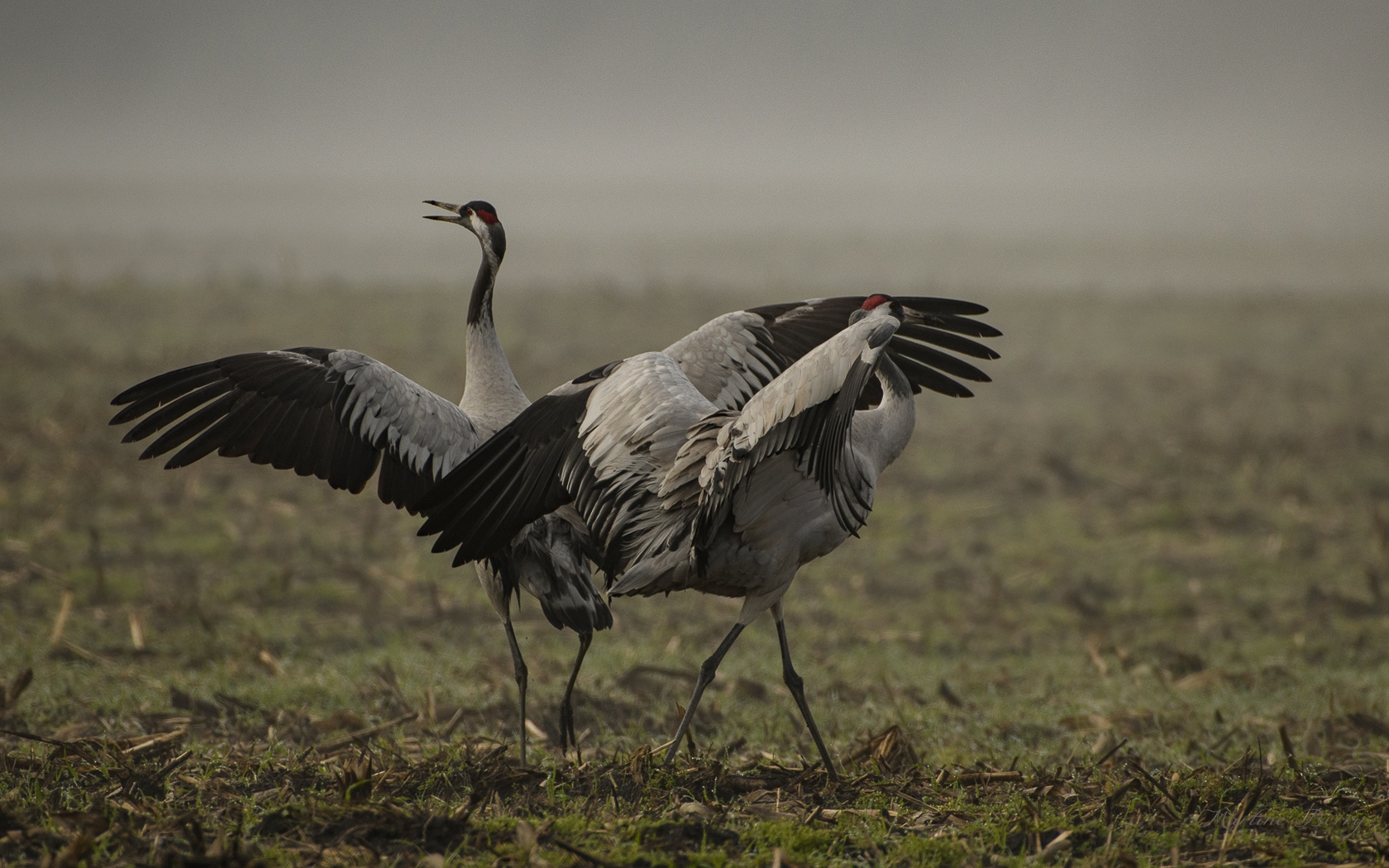 Description: A couple of birds standing on top of a grass covered field next to a field of grass and a field of flowers.