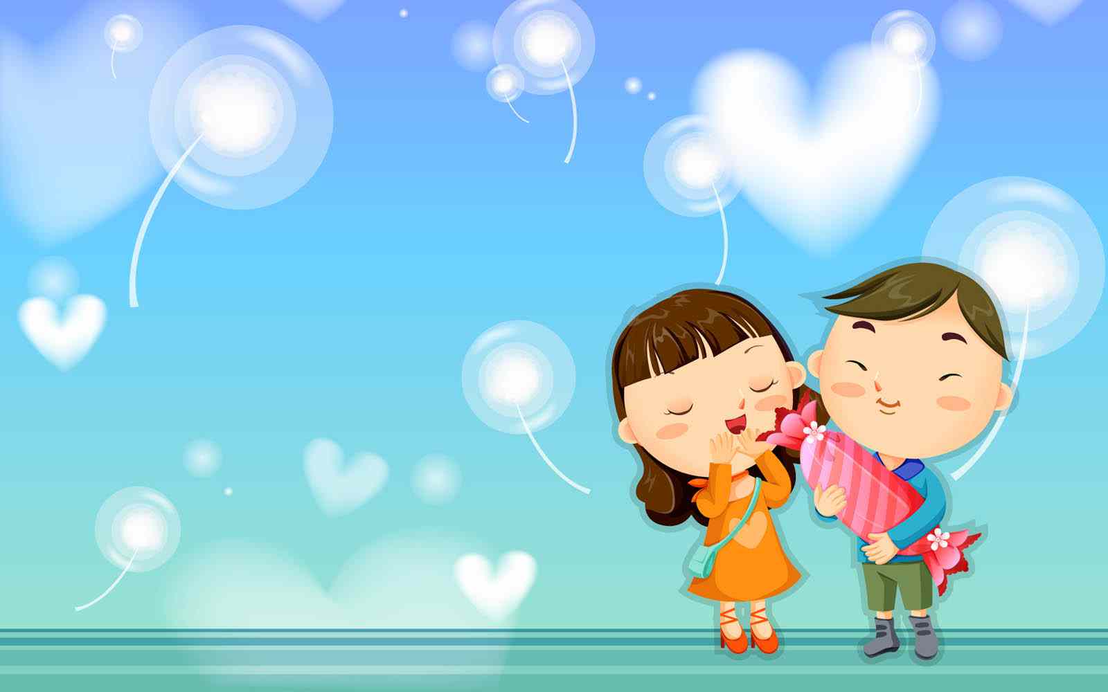 Description: A couple of people that are standing together with bubbles in the air behind them and a sky with clouds.
