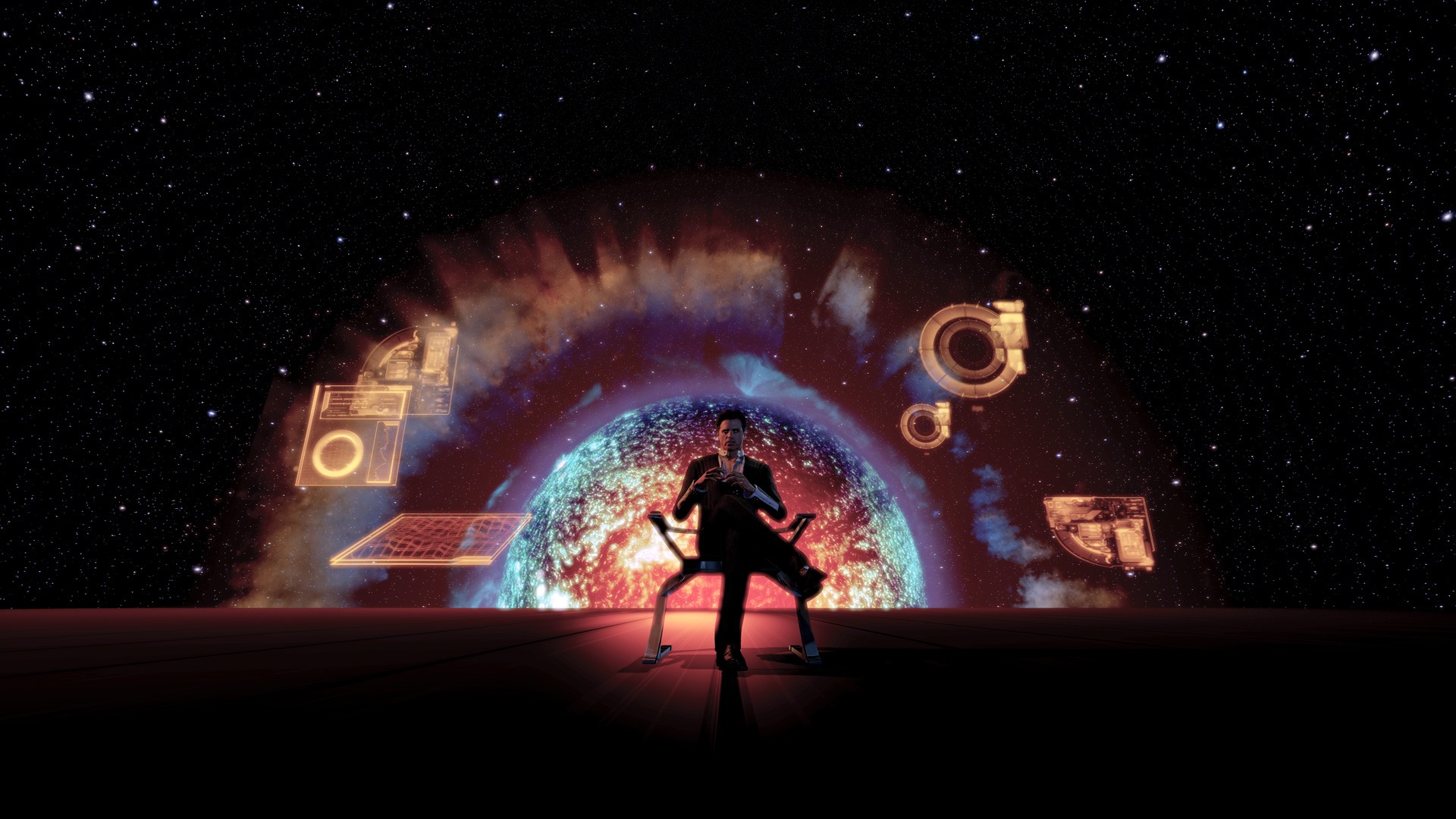 Description: A couple standing in front of a large colorful object in the dark night sky with a laptop on the floor.