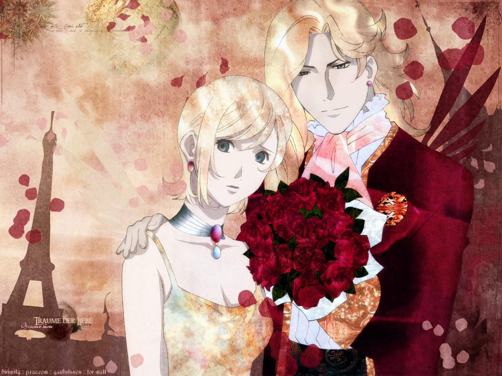 Description: A couple of people standing next to each other holding flowers in front of a painting of the eiffel tower.