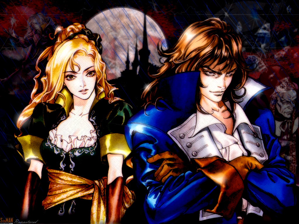 Description: A couple of people standing next to each other in front of a full moon and a castle with a clock.