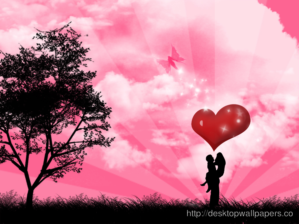 Description: A couple holding a heart shaped balloon in front of a tree and sky with a pink background with a pink sky and clouds.